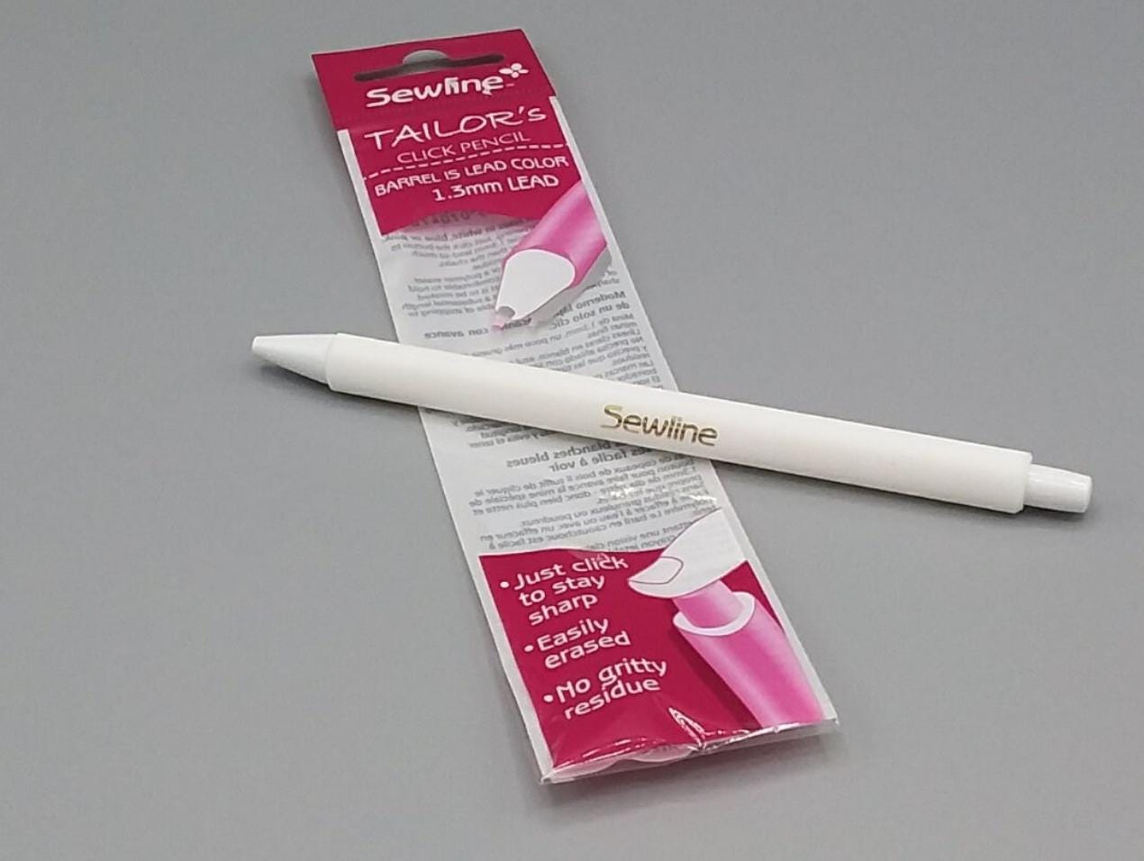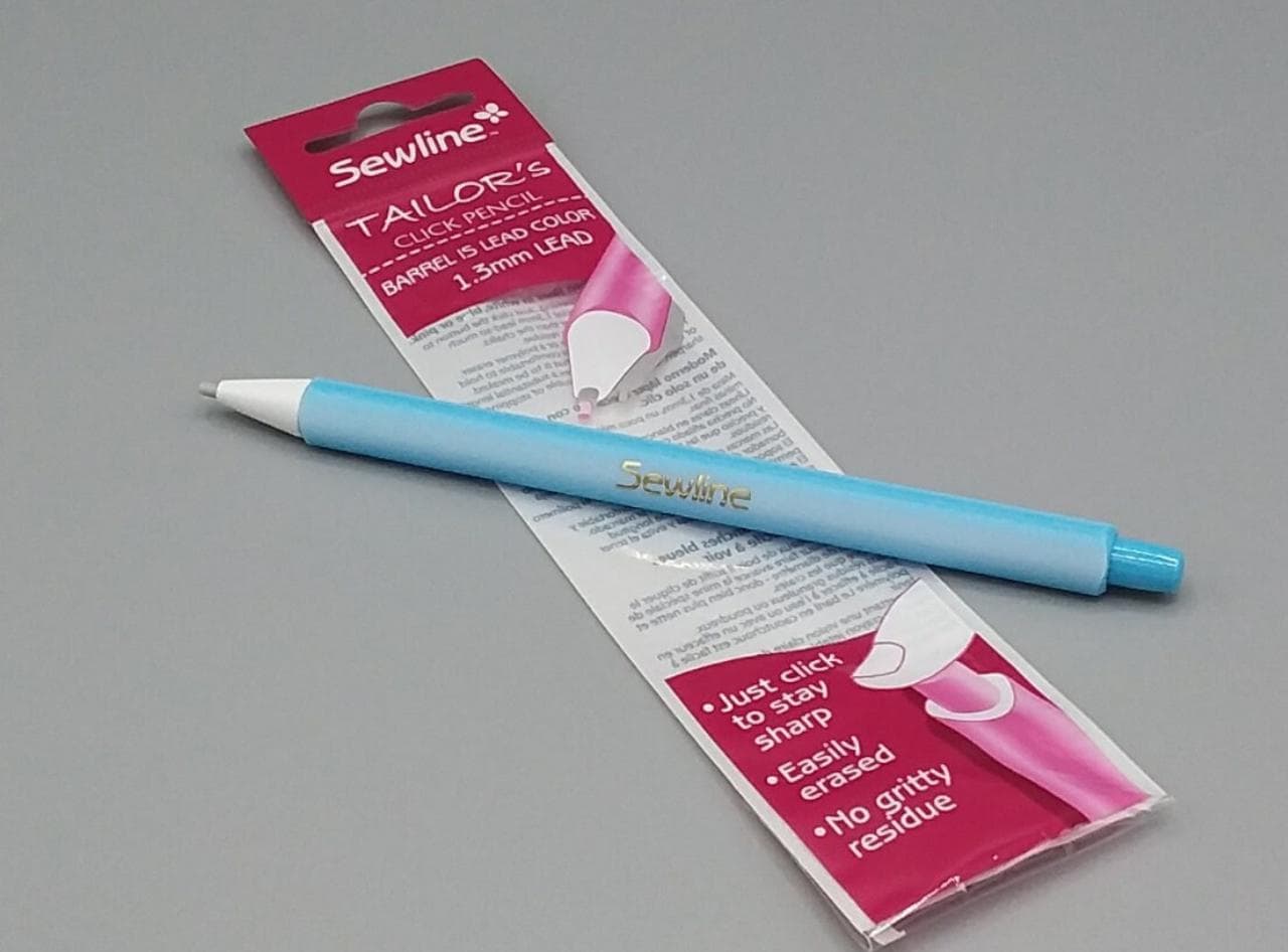 Sewline Tailor's click pencil... a must have by you sewing machine if you are quilting. Just click to stay sharp, easily erased, and no gritty residue. The color choices: pink, blue, and white