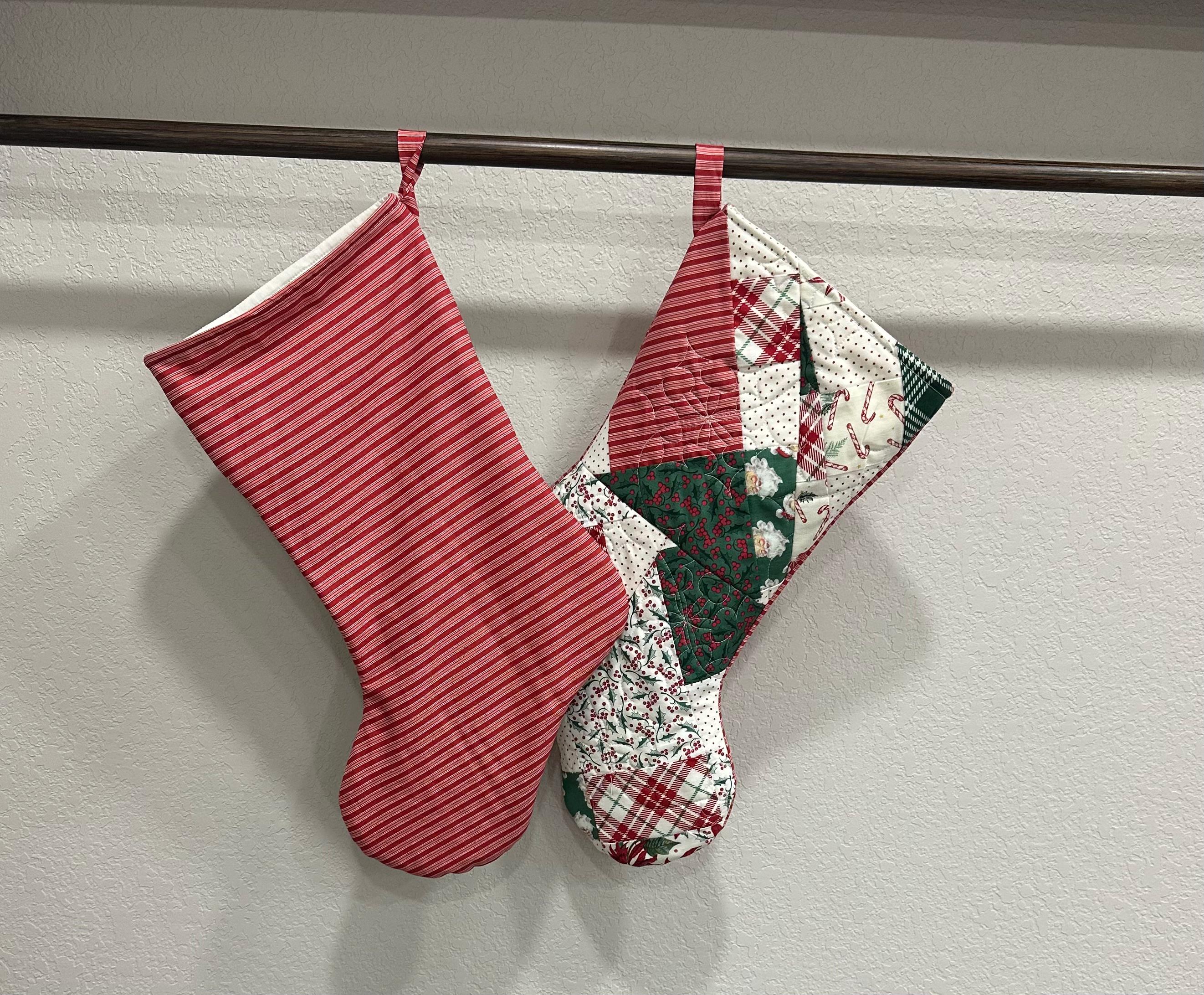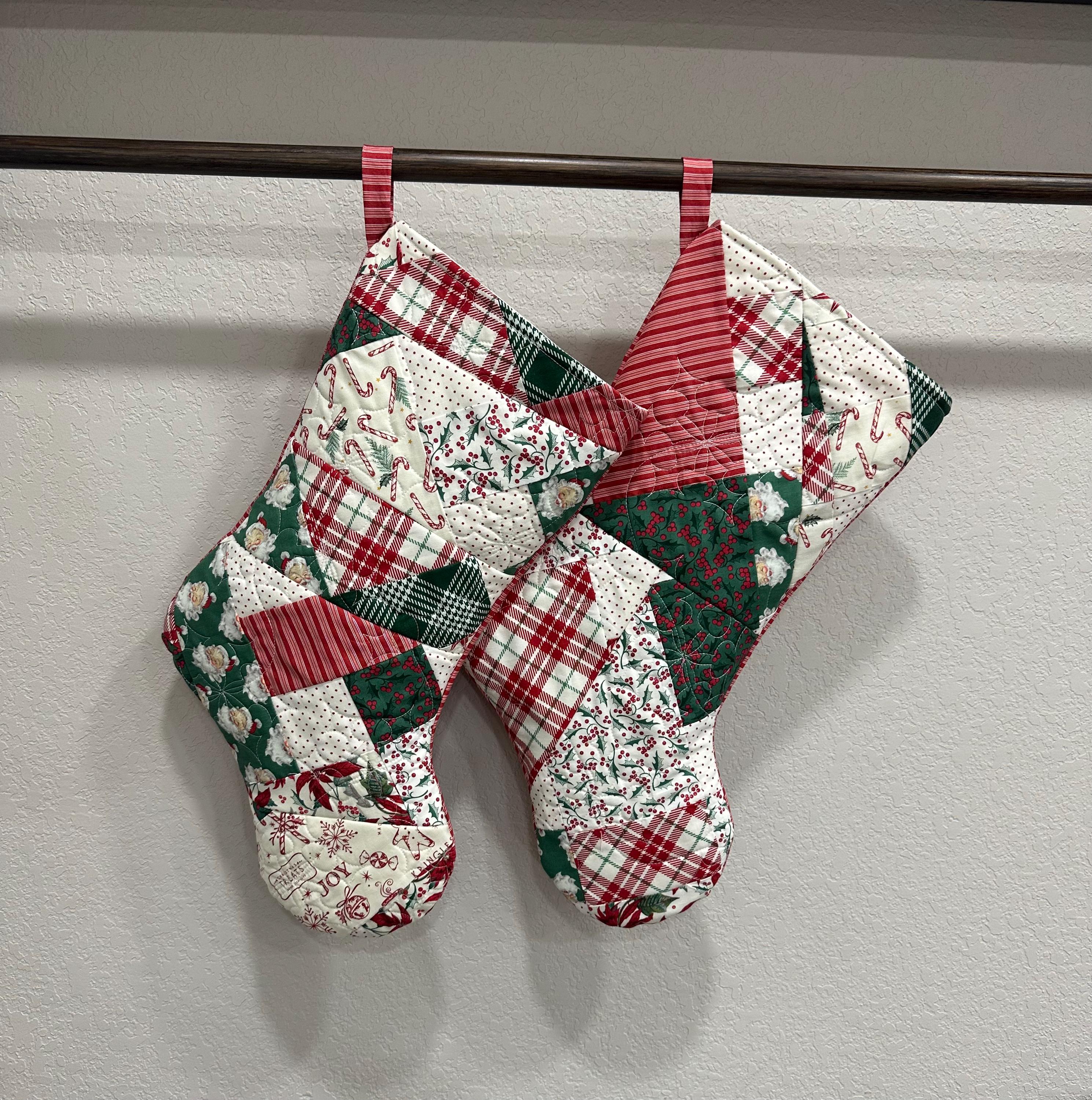 Each stocking has the hand pieced patchwork on front and coordinated print on the back.