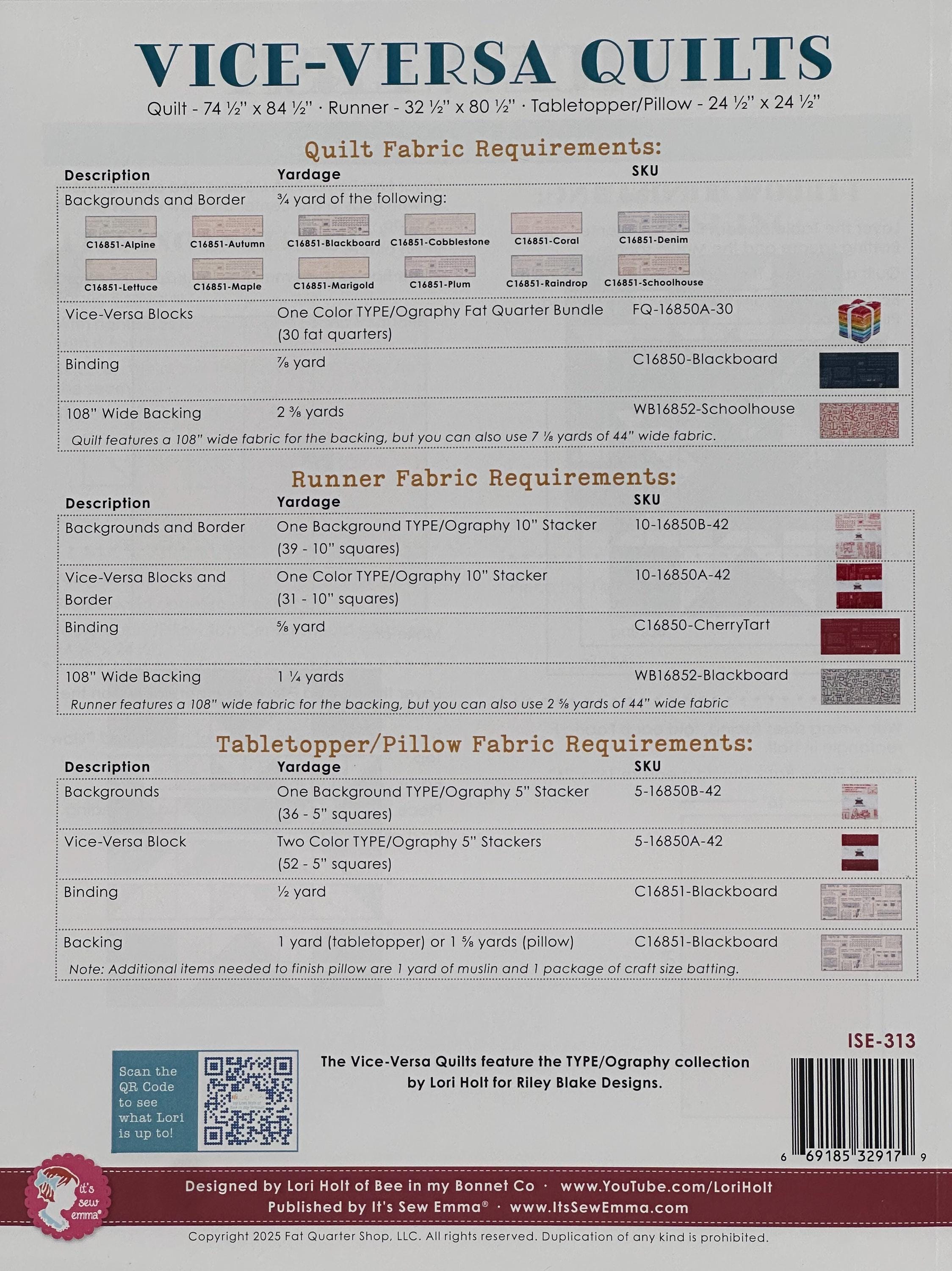 The Vice-Versa Quilt Pattern by Lori Holt of Bee in My Bonnet showcases a sawtooth star block, creating an engaging contrast between the background and print fabrics. In this design, the background can be the focal point, or the print can take center stage- vice Versa! The pattern offers three design options: a twin quilt, a runner, and a pillow/table topper. It features the TYPE/ography collection by Lori Holt for Riley Blake Designs. Finished Sizes: Quilt 74.5in x 84.5in / Runner 32.5in x 80.5in/ Pillow/Table topper 24.5in x 24.5in