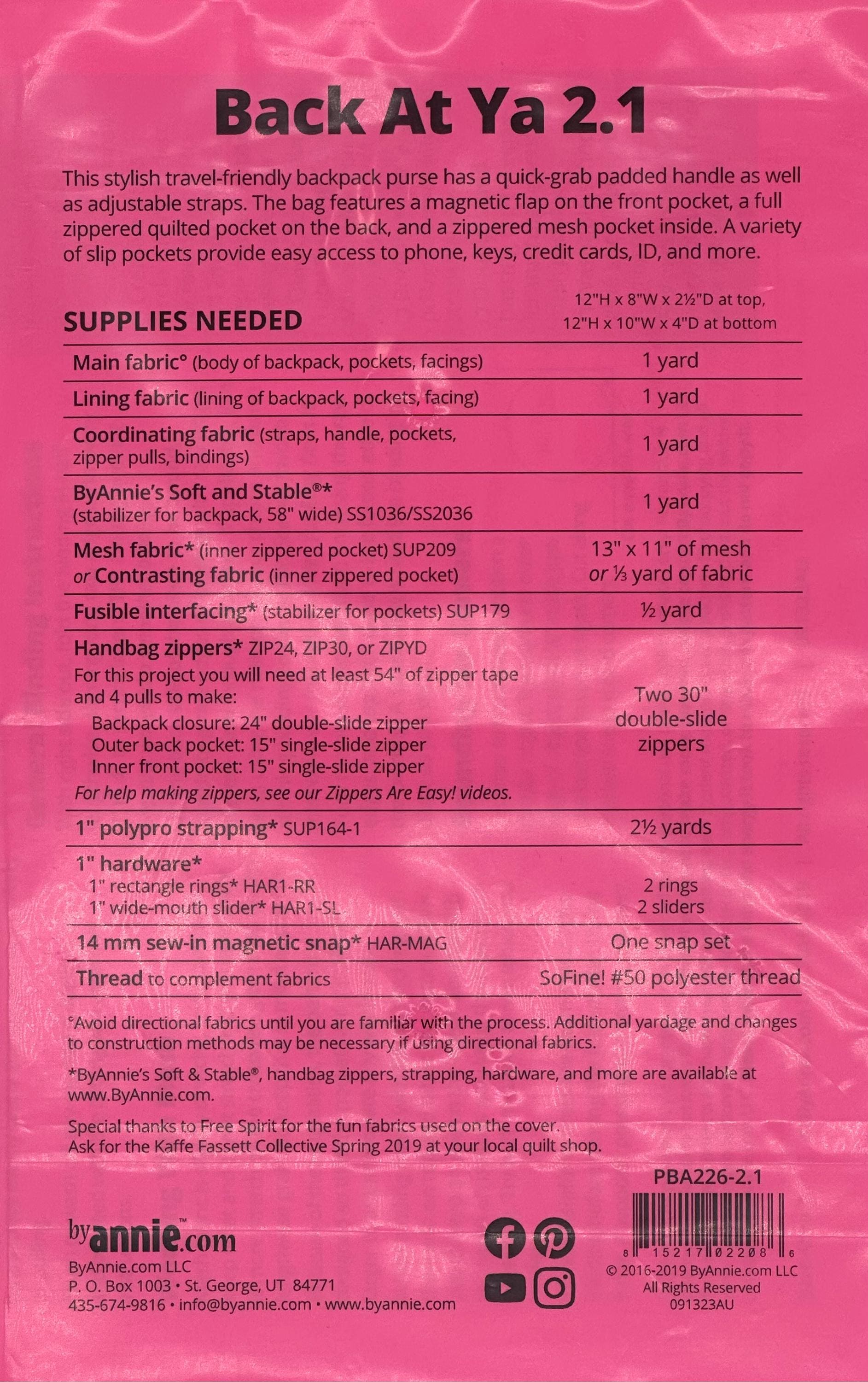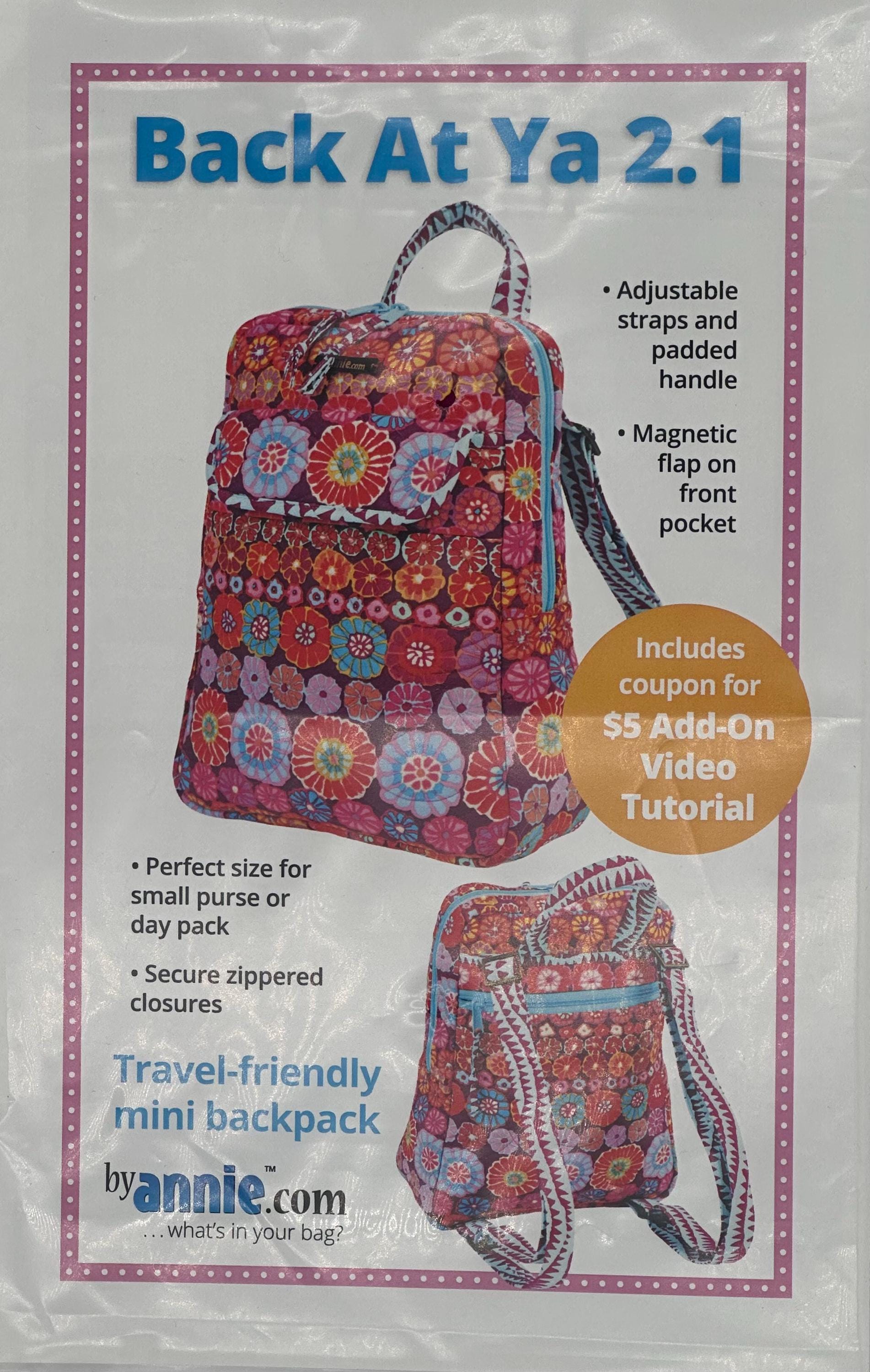 This stylish travel-friendly backpack purse has a quick-grab padded handle as well as adjustable straps. The bag features a magnetic flap on the front pocket, a full zippered quilted pocket on the back, and a zippered mesh pocket inside. A variety of slip pockets provide easy access to phone, keys, credit cards, ID, and more. Finished size of backpack: 12in H x 8in W x 2.5in D at top, 12in H x 10in W x 4in D at bottom. NOTE TO STORES: Back At Ya 2.1 is an update of Back At Ya 2.0 which was released in 2017. Just like a new edition of a textbook, this new version of the pattern features improved design and layout, easier-to-follow steps and diagrams, and our newest and best techniques.